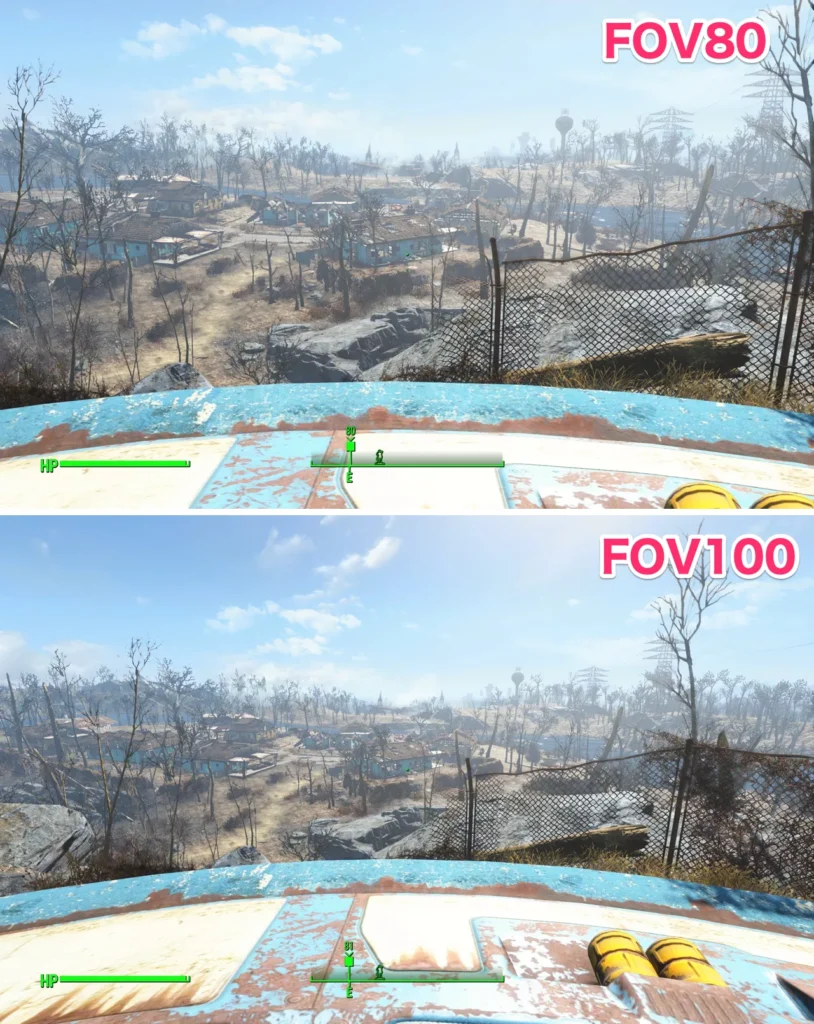 ゲームをスタートしてすぐ、Vault111から出たときで比較してみました。デフォルトのFOV80に比べ、FOV100だと一歩引いた視点でより広く前方が見えているのが分かると思います。